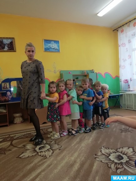 . Программное содержание: учить детей реализации игрового замысла, поддерживать ролевой диалог; развивать игровые умения и воображения; продолжать учить подражать повадкам животных; развитие театрализованной деятельности; развитие артикуляционного аппарата, развитие двигательного аппарата шейного и грудного отделов; воспитывать положительные взаимоотношения между детьми. Оборудование: куклы лесных зверей, елки, листочки, искусственные овощи и грибы, письмо Подготовка к игре: Чтение стихотворений о железнодорожном транспорте, рассматривание иллюстраций с железнодорожным транспортом, подвижная игра «Поезд». Ход развлечения. (Начинаю игру.) - Ребята, посмотрите, к нам в группу пришло письмо, давайте его прочитаем. Лесные зверушки приглашают нас в лес, к себе в гости. Кто хочет поехать со мной на поезде? Тогда давайте построим поезд, будете мне помогать? Становитесь друг за дружкой, вы будете вагончиками, а я – паровозом! (Дети строятся друг за другом) - Ну вот, наш поезд готов! -Все расселись по местам? Я сейчас гудок подам! (Звучит музыка «Паровоз») - Вот мы и приехали. Это станция «Лесная». Здесь в лесочке погуляем, И зверушек повидаем. Ребята, посмотрите – зайчик такой грустный сидит, давайте его развеселим и на время превратимся в зайчиков «Зайка серенький»? (игра «Зайка серенький») Ай да детки, ай да молодцы развеселили зайчика! По лесочку погуляли, Поплясали, поиграли. Надо быстро покружиться, И в ребяток превратиться. А пока мы с вами превращались обратно в деток, посмотрите, что я нашла? Зонтик. Когда светит солнышко, Можно погулять: Хлопать, топать весело, Нам в лесу играть. Если тучка хмурится И грозит дождем. Спрячемся под зонтиком, Дождик переждем. (игра «Солнышко и дождик») А к кому мы еще приехали вы сейчас угадаете – «Хитрая плутовка, рыжая головка, хвост пушистый краса, а зовут ее … Лиса». Здравствуй лисичка. Что у тебя случилось? Артикуляционная гимнастика Па-па-па-па- болит у лисы лапа. Пе -пе-пе-пе- ранка на лапе. Пу-пу-пу-пу- мы полечим лапу. Пы-пы-пы-пы - а у волка здоровые лапы. Развитие силы голоса. Упражнение «Волк» Волк далеко (тихое пропевание звука (У) Волк близко (громкое пропевание звука (У) - Ой, на полянку выбежал маленький ежик! Посмотрите, как много он собрал себе запасов на зиму в корзиночке! Мы сейчас узнаем, что же он там спрятал (дети достают из корзинки фрукты и называют их). Молоды, ребята! Только тихо, слышите, кто-то идет (звучит «мишка косолапый). Вам понравилось, ребята как с нами поиграл мишка? Но нам пора возвращаться в детский сад. Посмотрите, сколько на полянке лежит красивых листочков! Давайте соберем их, и станцуем веселый танец (танец с листочками). Но нам пора возвращаться в детский сад. Садитесь в паровозик! -Все расселись по местам? Я сейчас гудок подам! -«Ту-у - ту-у». Загудел паровоз и вагончики повез. Разгоняем колеса «чу- чу -чу» (Звукоподражания стуку колес, с начало медленно а потом быстрее) (звучит музыка «Паровоз») Но вот остановка, пора выходить. Тормозим поезд (звукоподражания «шшшшш»… .) - А вот и наша остановка, мы приехали в детский сад! Где мы с вами были, ребята? Кого мы с вами там повстречали? Вам понравилось? Молодцы, ребята! Будем еще с вами путешествовать? Ну тогда в следующий раз мы поедем в гости к бабушке в деревню. 4 ноября 2019 в 12:21