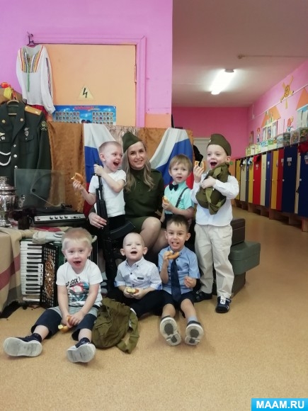 Воспитатель: Вот и стали мы с вами сильными и ловкими. А когда мальчики вырастут, тоже, как папы, пойдут служить в Армию и станут защитниками, солдатами.
